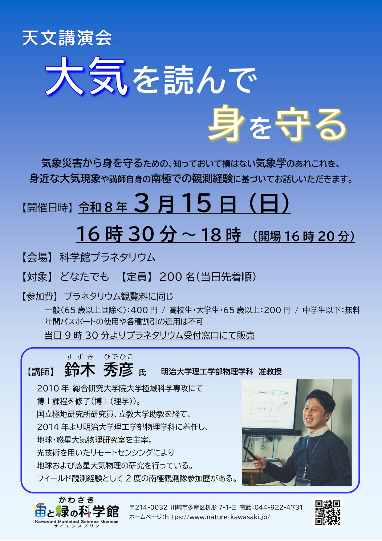気象災害から身を守るための、知っておいて損はない気象学のあれこれを、身近な大気現象や講師自身の南極での観測経験に基づいてお話しいただきます。